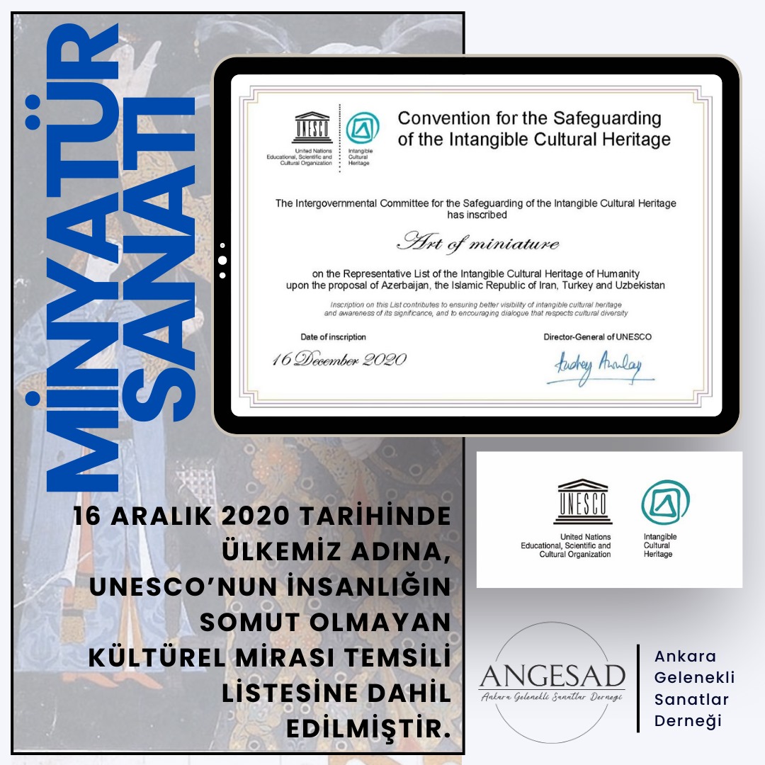14-19 Aralık 2020 tarihlerinde çevrim içi olarak düzenlenen 15. Somut Olmayan Kültürel Miras Komite Toplantısı’nda “Minyatür Sanatı”, Azerbaycan, İran ve Özbekistan’la birlikte Türkiye adına UNESCO İnsanlığın Somut Olmayan Kültürel Mirası Temsilî Listesi’ne kaydedilmiştir.